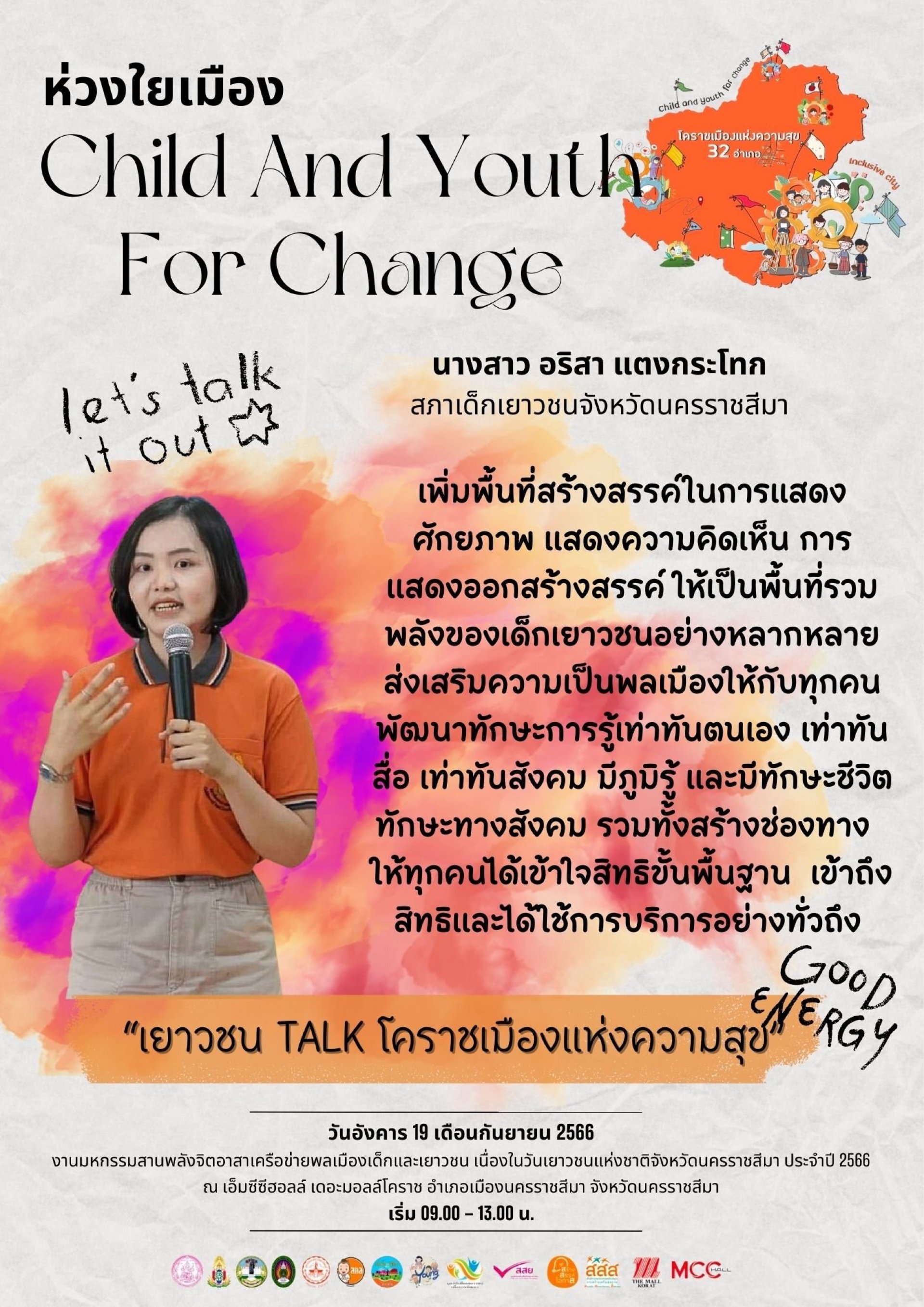 ทุกพื้นที่ในจังหวัดนครราชสีมาต้องพร้อมที่จะเป็นพื้นที่สร้างสรรค์และปลอดภัยในการแสดงความคิดเห็นและการแสดงความสามารถของกลุ่มเด็กและเยาวชน ไม่ว่าจะเป็นเด็กที่อยู่ในระบบการศึกษานอกระบบการศึกษาหรือกลุ่มเด็กและเยาวชนผู้พิการให้กลุ่มเด็กทุกกลุ่มสามารถอยู่ร่วมกันและสานพลังได้อย่างมีประสิทธิภาพ