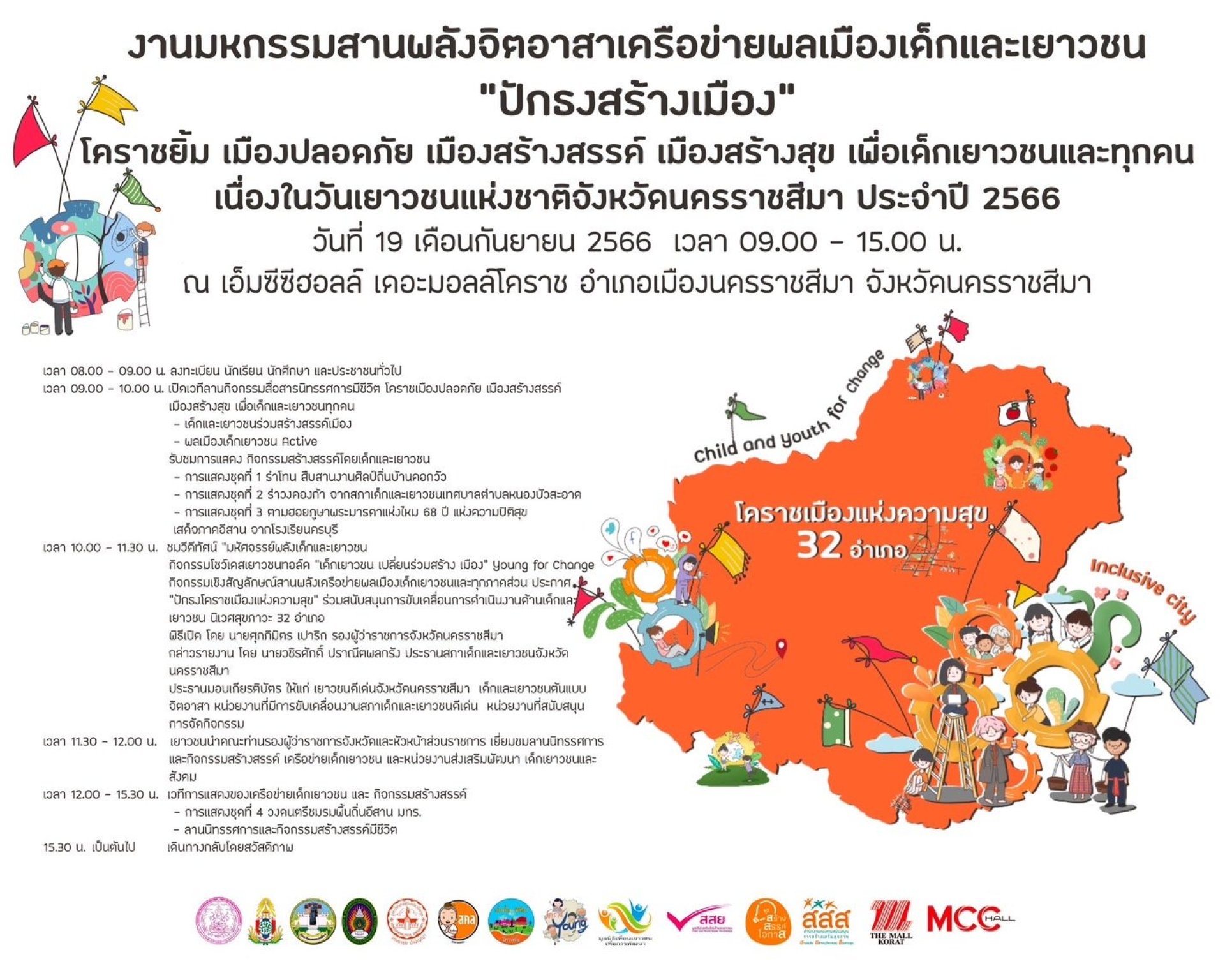 ผนึกความร่วมมือ สานพลังจิตอาสาเครือข่ายพลเมืองเด็กและเยาวชน จังหวัดนครราชสีมาปักธง 32 อำเภอ โคราชเมืองปลอดภัย เมืองสร้างสรรค์ เมืองสร้างสุข เพื่อเด็กเยาวชนและทุกคน โดยมีข้อเสนอแนวทางการ ร่วมสร้างและพัฒนาเมือง ดังนี้