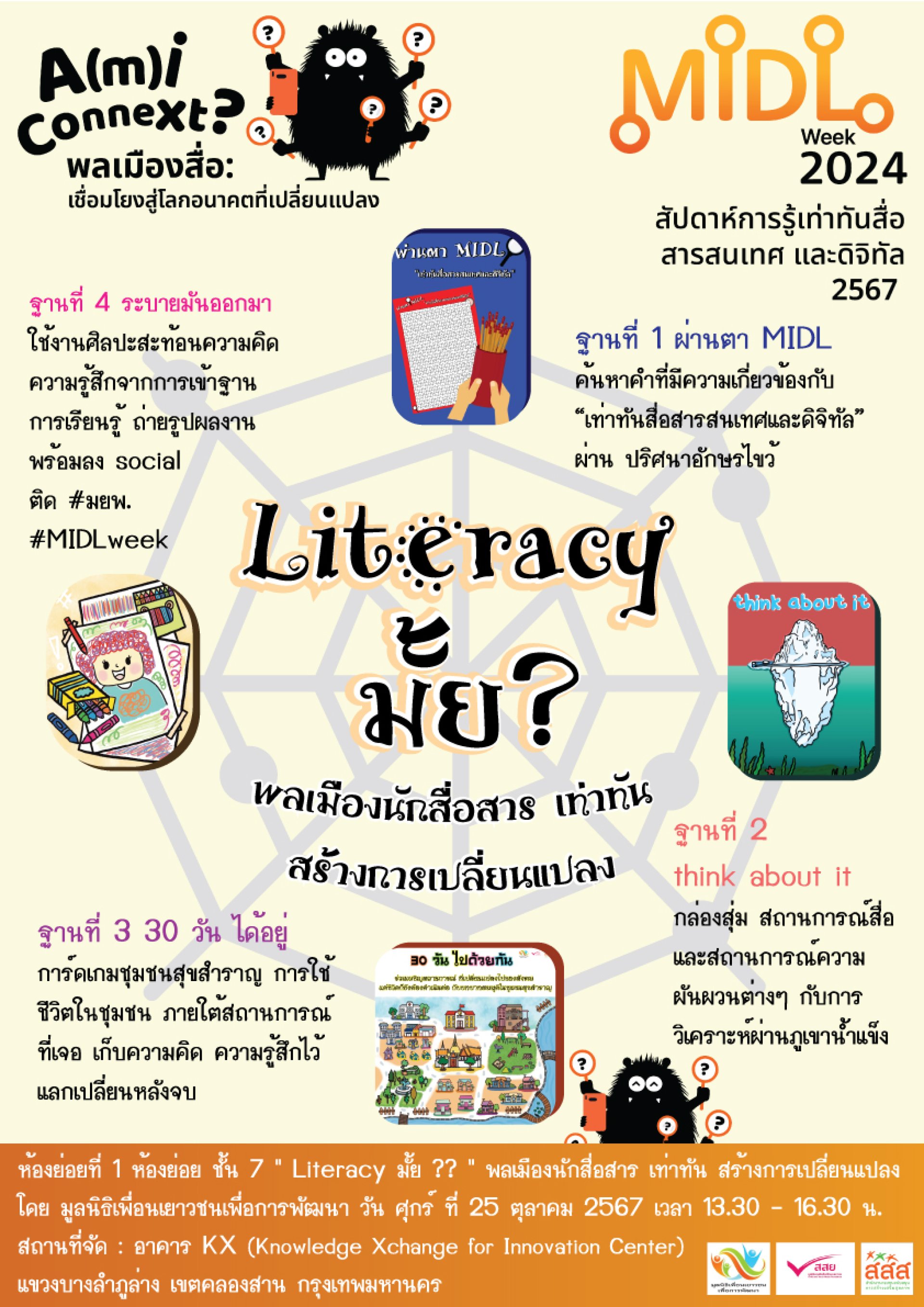 มหกรรมการรู้เท่าทันสื่อ สารสนเทศ และดิจิทัล A(m) I Connext? พลเมืองสื่อ: เชื่อมโยงสู่โลกอนาคตที่เปลี่ยนแปลง Literacy มั้ย ?? ชวนมารู้จักทักษะเท่าทันสื่อ MIDL เห็นถึงพลังของสื่อ เชื่อมโยงกับสถานการณ์การเปลี่ยนแปลงที่กระทบต่อผู้คน และร่วมสะท้อนความคิด มุมมอง ที่หลากหลาย ฐานกิจกรรมการเรียนรู้ ภายใต้แนวคิดเรื่องพลเมืองกระบวนการนักสื่อสารสุขภาวะส่งเสริมการส่วนร่วม และการเรียนรู้บนฐานชุมชน